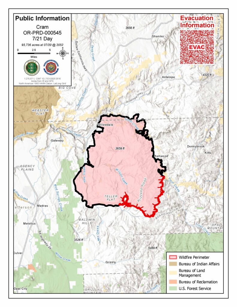 Evacuations: Evacuations remain in effect, but some zones have recently been downgraded. Jefferson, Wasco and Crook County Sheriffs have issued Level 3 (GO NOW), Level 2 (BE SET), and Level 1 (BE READY) evacuations across multiple zones. Please refer to official evacuation maps for the most up-to-date info. Jefferson County: tinyurl.com/JCSOEvacMap, Wasco County: tinyurl.com/WascoCountyEvacMap, Crook County: tinyurl.com/CrookCountyEvacMap
