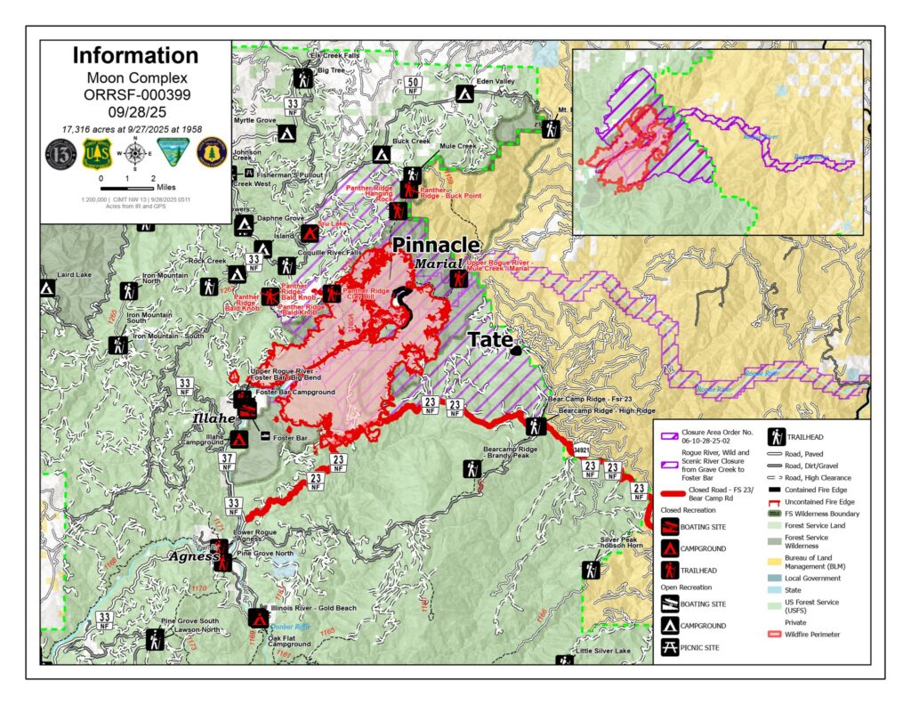 The Moon Complex fire continues to threaten communities along the Rogue River corridor as firefighters battle fast-moving flames. Significant growth was reported Friday, and evacuation orders and closures remain in place across parts of Southwest Oregon. Crews are working to protect homes, businesses and recreation areas as changing weather and heavy smoke complicate operations.